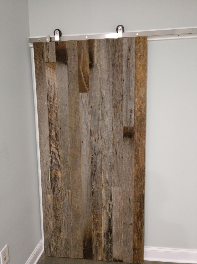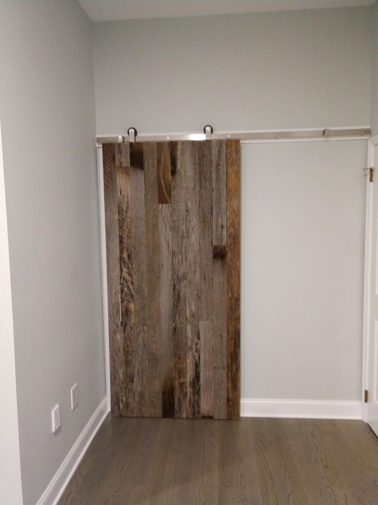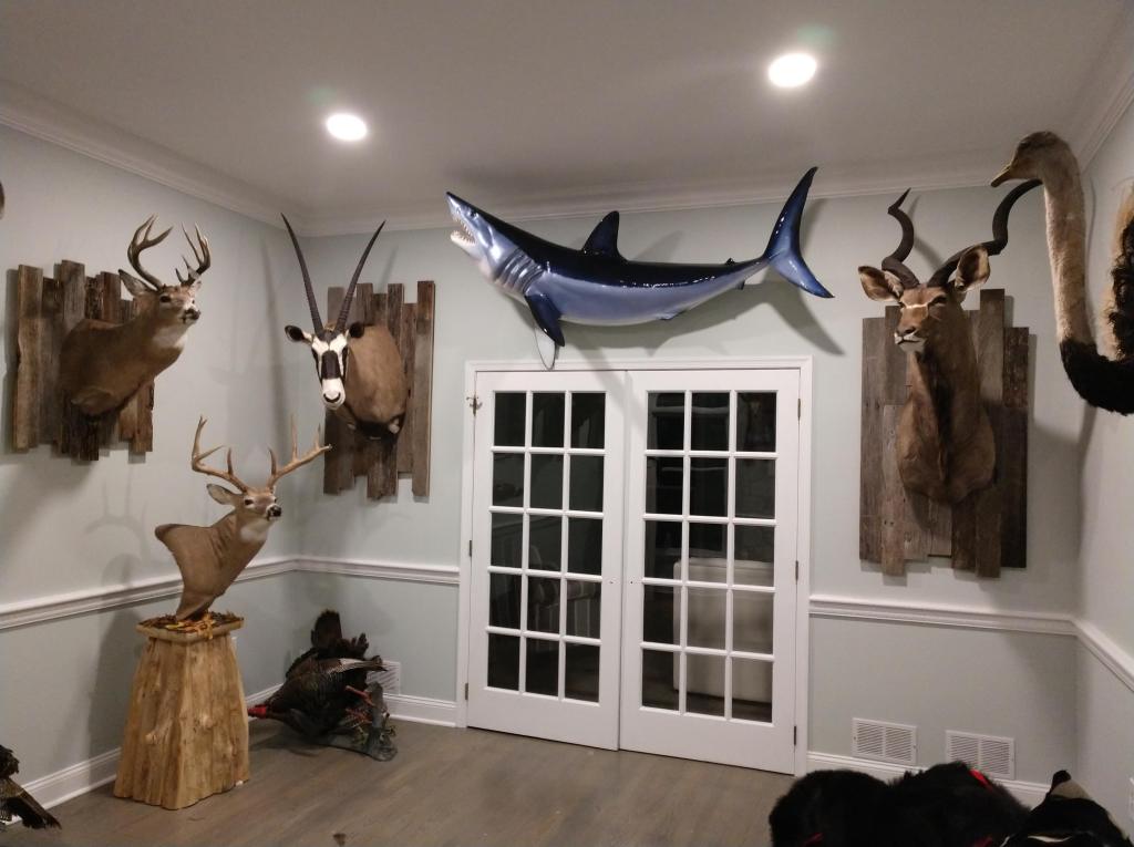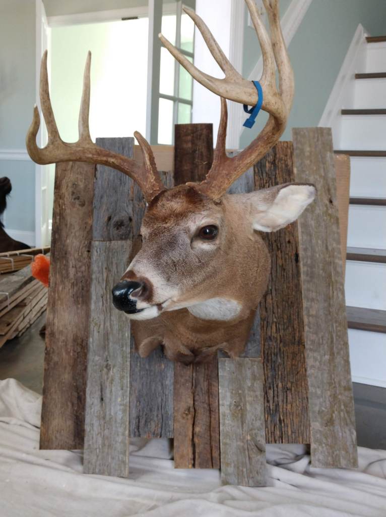 This project features custom taxidermy plaques made of artfully arranged reclaimed wood, paired with matching bedroom décor including a headboard and sliding barn doors. A coordinating backsplash of the same reclaimed wood ties in the built-in bookcase in another room.