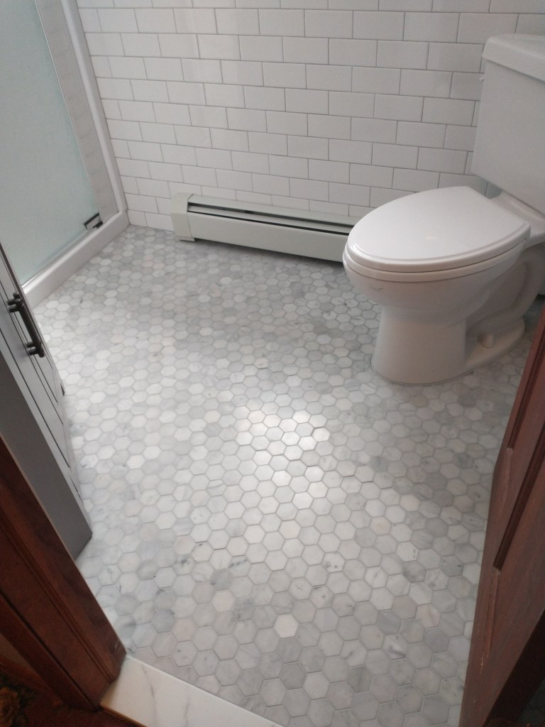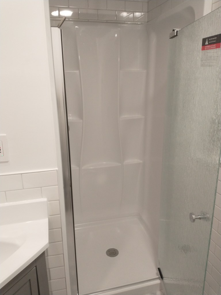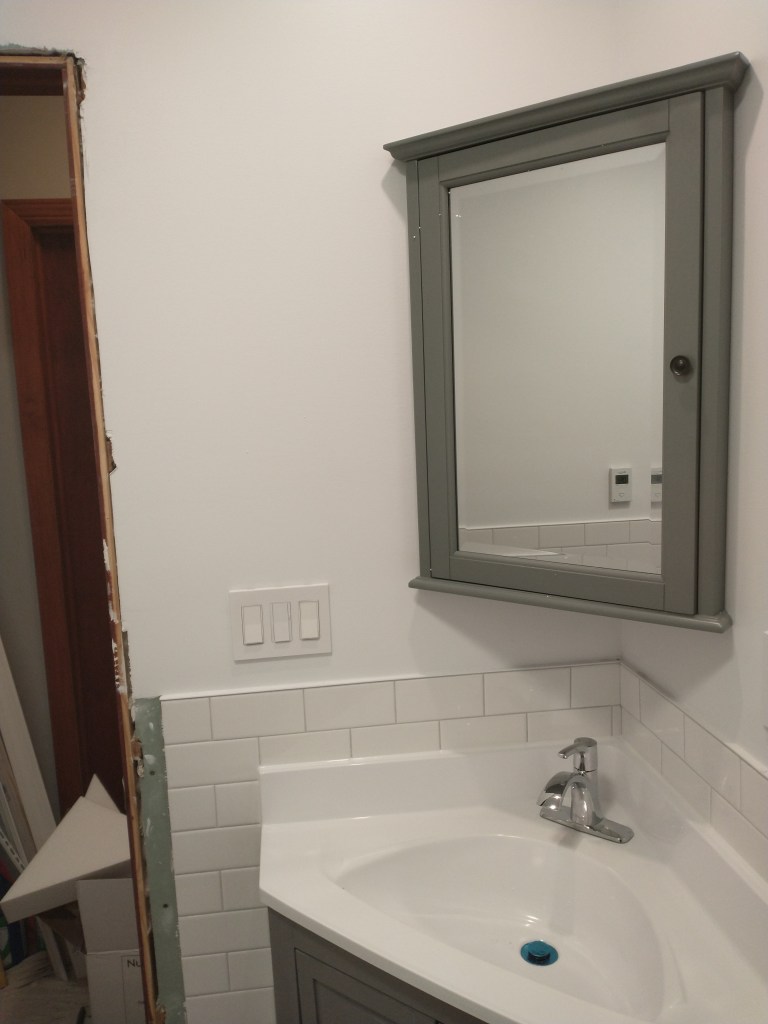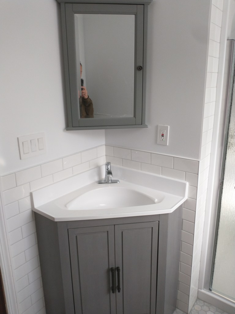 This bathroom was brought up to date with a clean, simple, gray and white color pallet. This included new paint and new fixtures including a new vanity and shower hardware.